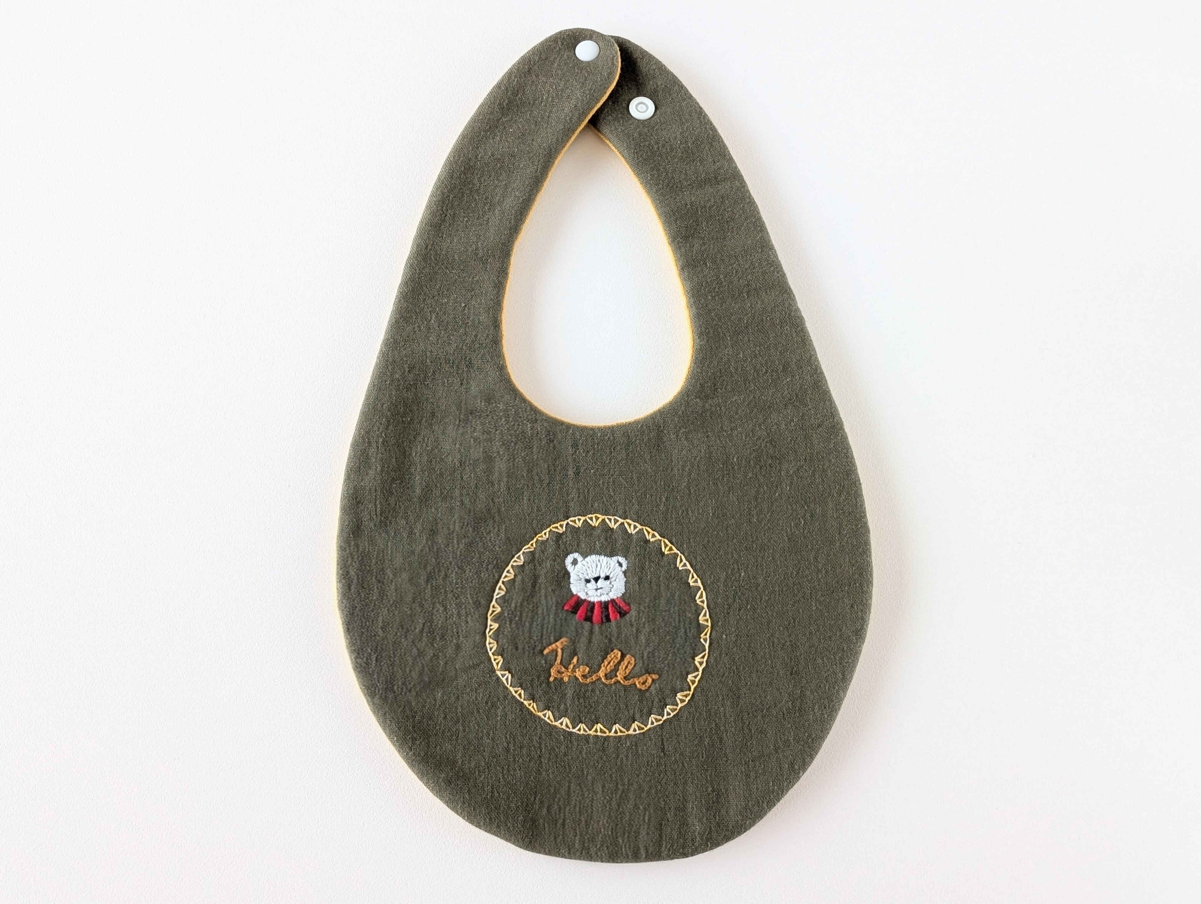 表裏ともに水通し済みで型崩れしにくく、間にキルト芯を挟むことで吸収力・速乾性もアップ。2段階スナップで長くお使いいただけます。